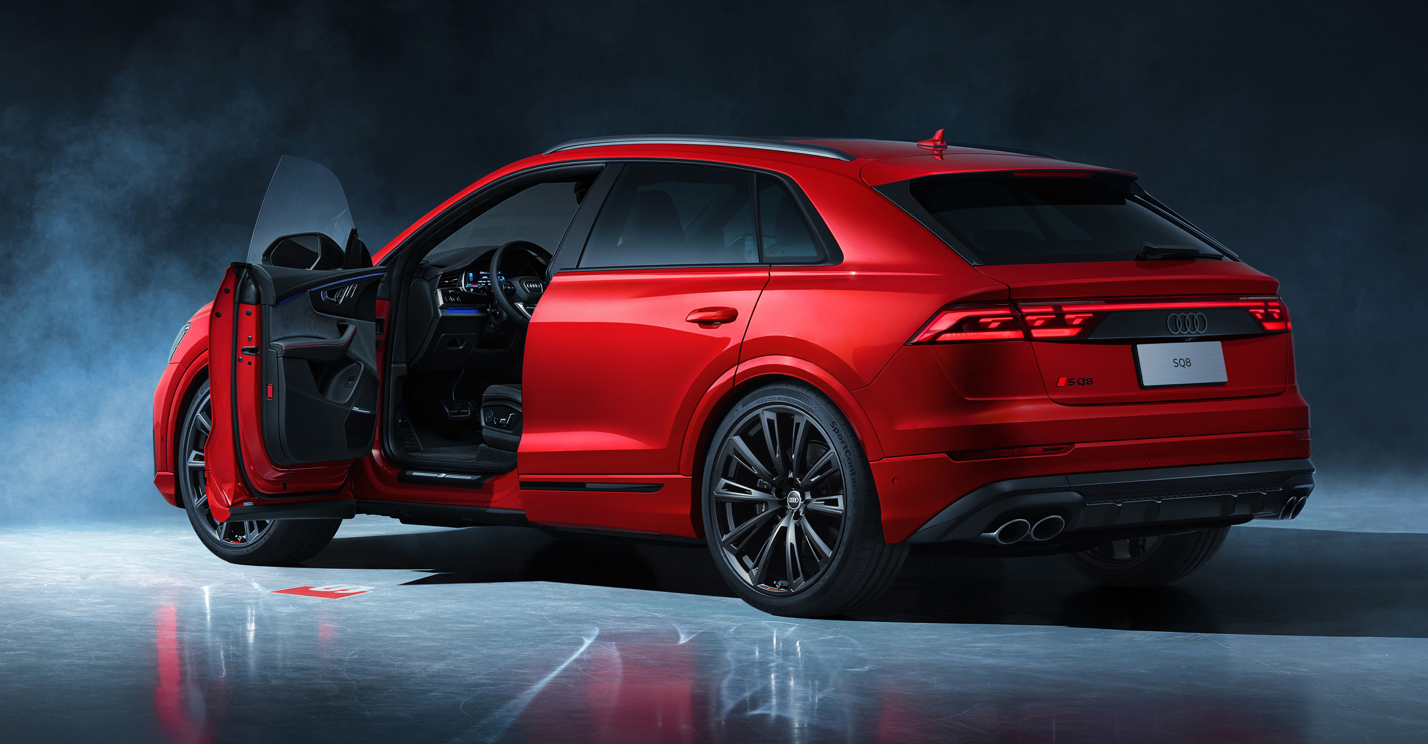 奥迪 SQ8 搭载 4.0L 双涡轮增压 V8 发动机,实现4.1秒零百加速