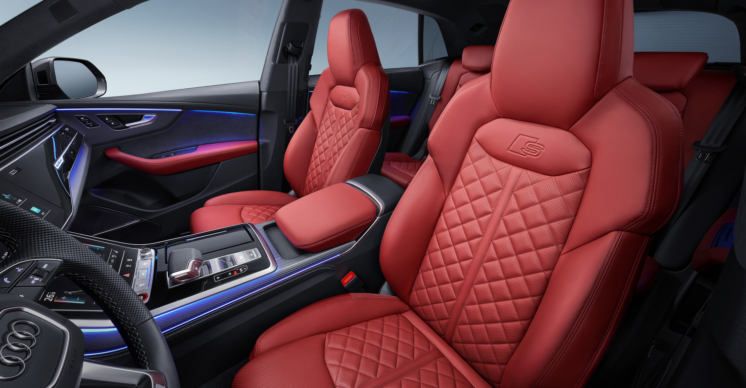 座舱之内,奥迪 SQ8 标配超级运动座椅采用华格纳真皮面料,辅以 S 压印/菱形缝线工艺,将包裹质感与视觉张力推向新境。9种车身颜色与4种内饰配色方案,以丰富选择回应多元审美,辅以碳纤维饰条点缀的真皮打孔运动方向盘、不锈钢踏板,在细节中渗透赛道运动基因,让驾驶者坐进座舱的瞬间,即可唤醒源自赛道的驾驭激情。